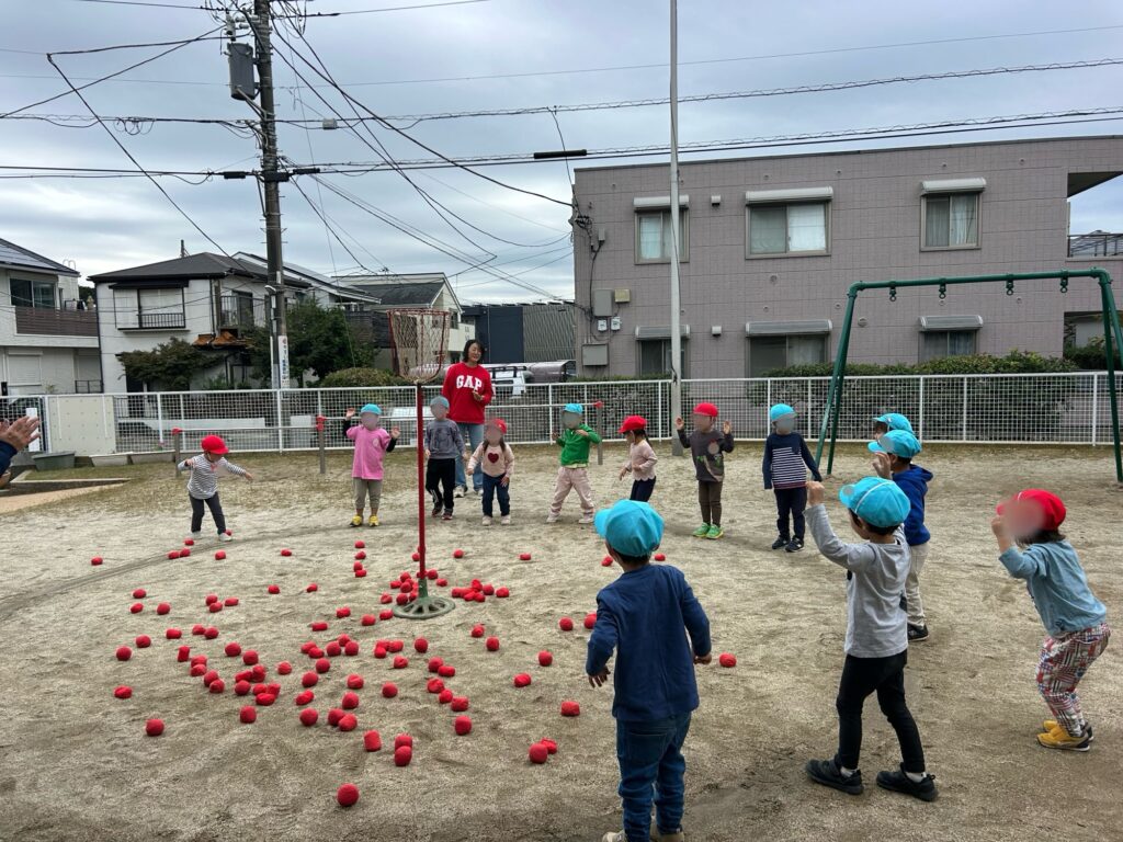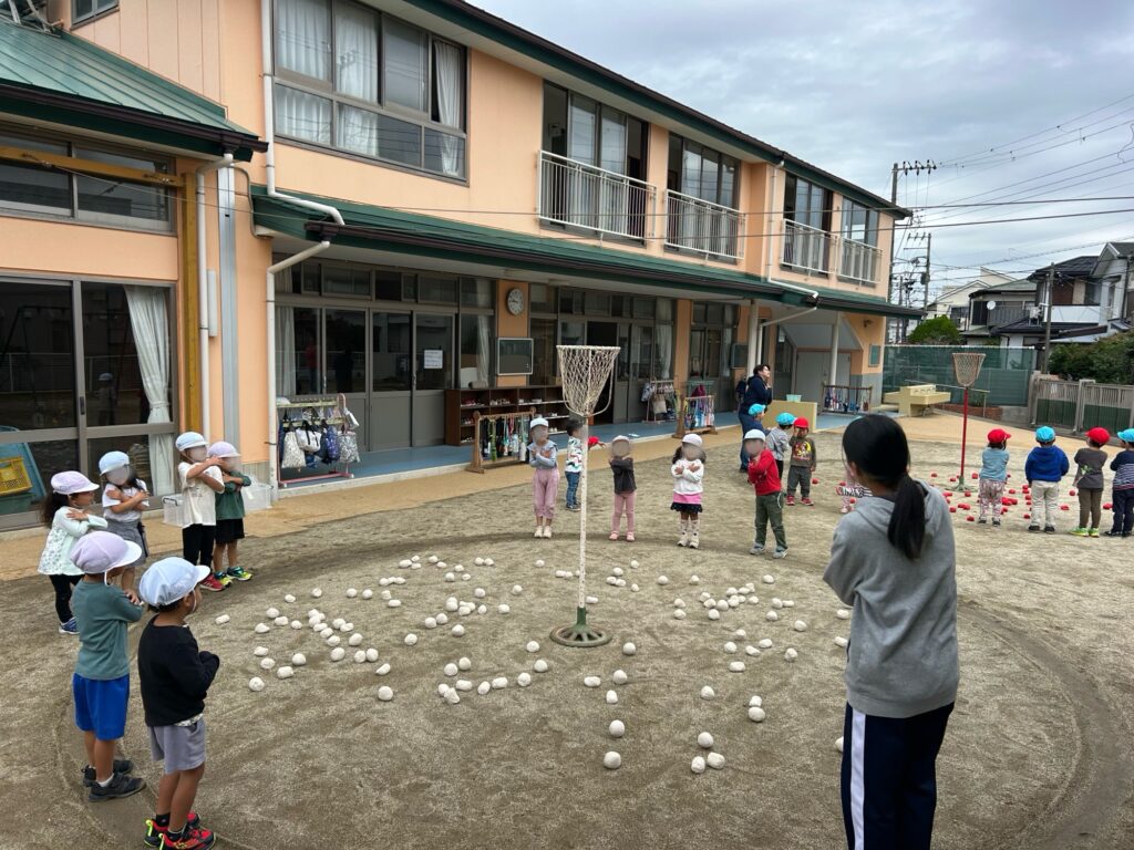 高いかごに向かって、斜めの方向に球を投げて入れることがなかなか難しく・・・・しかし、子どもたちは元気いっぱいにたくさんの球を投げていました。玉入れの後は、お片付け競争!遠くに飛んだ球も最後まで拾って綺麗にかごに戻すことができました👏