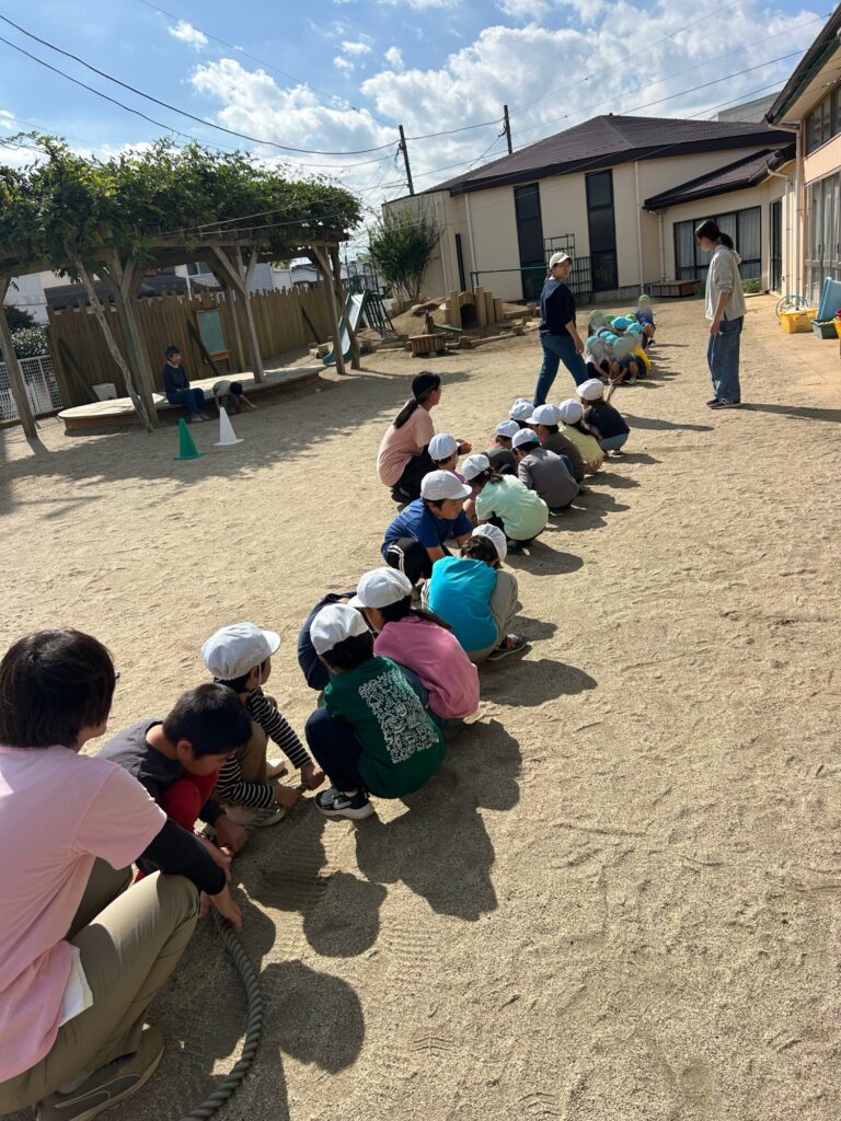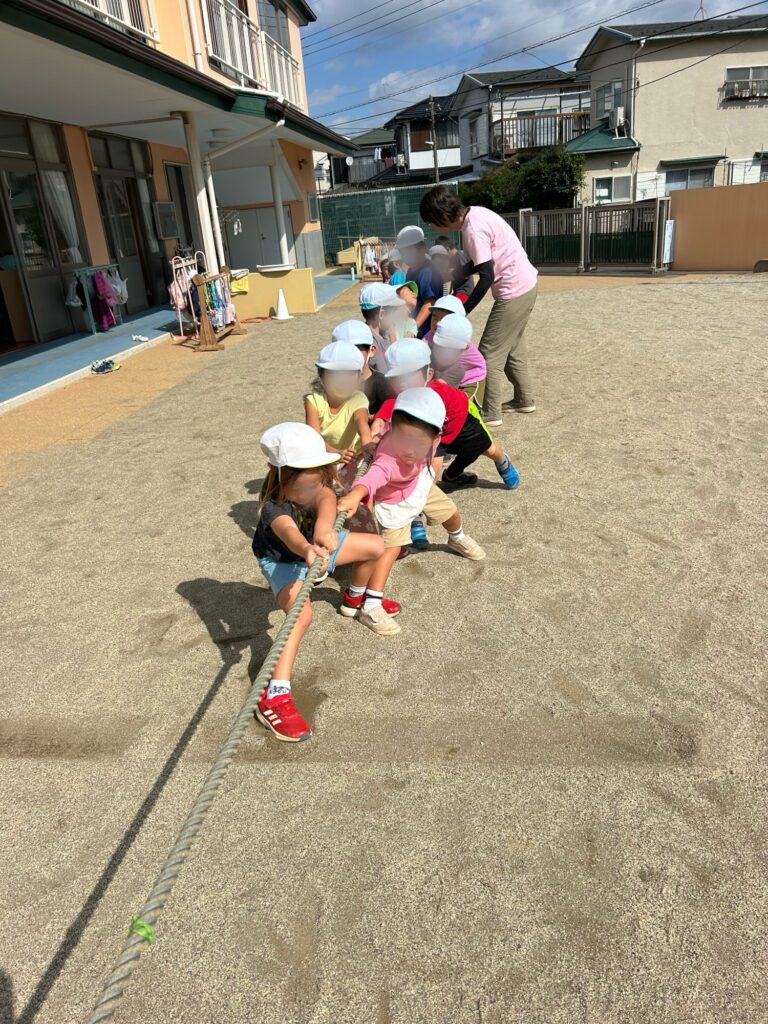 運動会の種目にはありませんが、保育の時間に年中・年少組で玉入れを、年中・年長組で綱引きをしました。