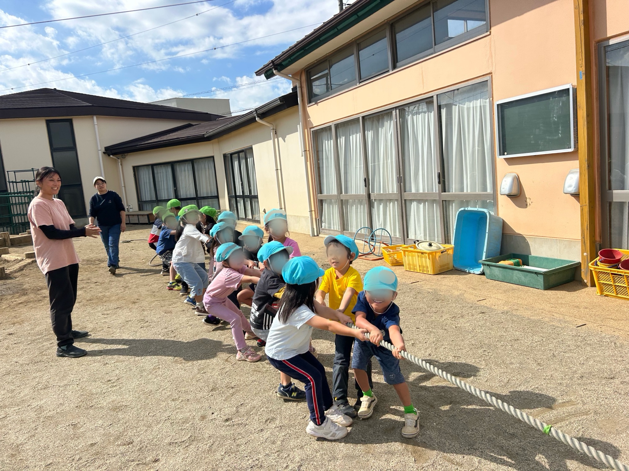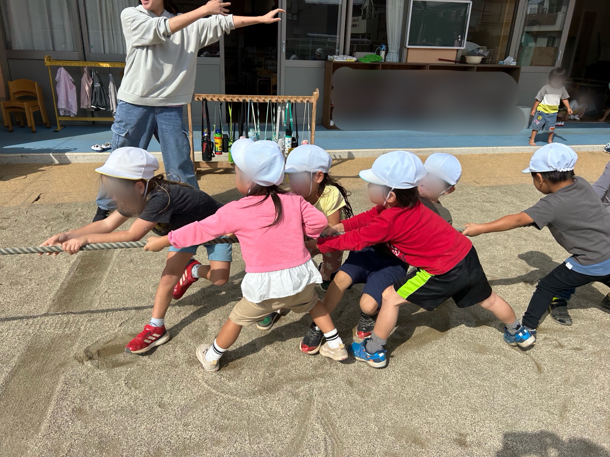 運動会の種目にはありませんが、保育の時間に年中・年少組で玉入れを、年中・年長組で綱引きをしました。