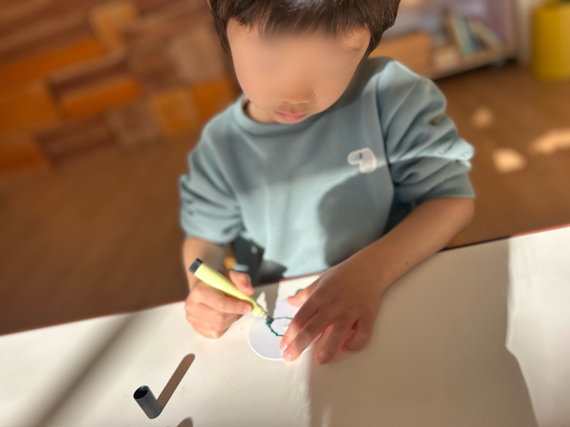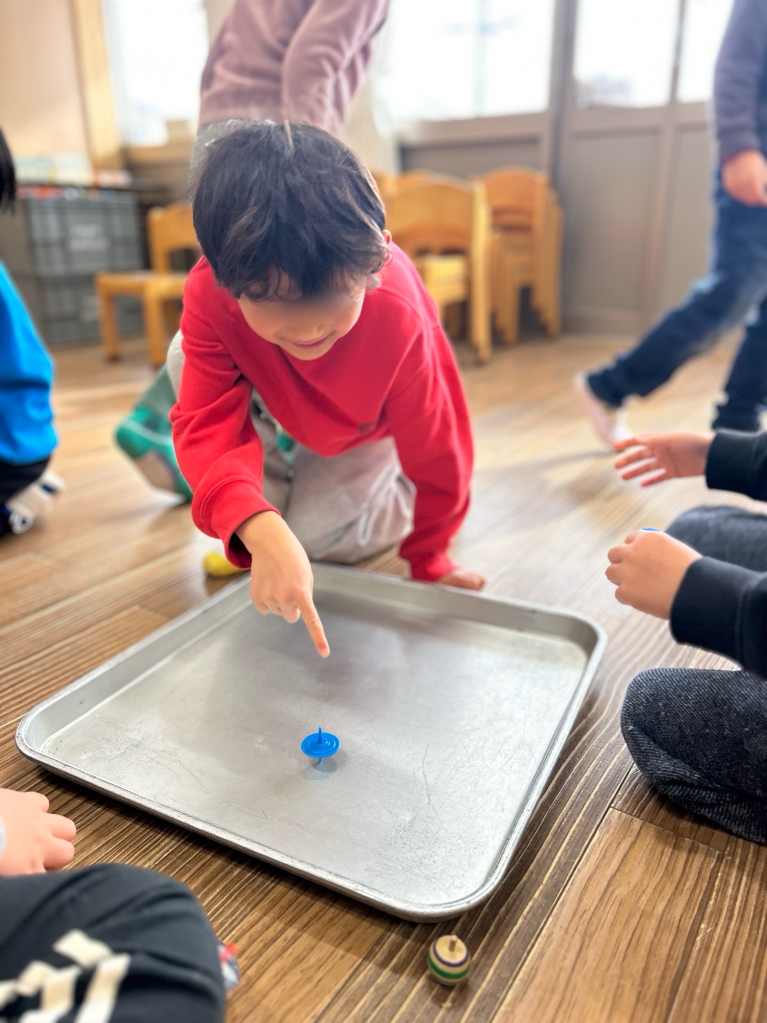 コマ回しは、年長さんがとっても上手なのでそれを見て、年中年少の子たちは真似をして頑張ってまわそうとしていました。親指と人差し指を使って回すコマ。普段しない動作なので初めは難しいですが、みんなコツをつかみ上手になりました。三角、丸、四角の型に好きな模様を描くので、回した時にそれぞれ違った模様が浮かび上がりとても素敵なコマ遊びとなりました。