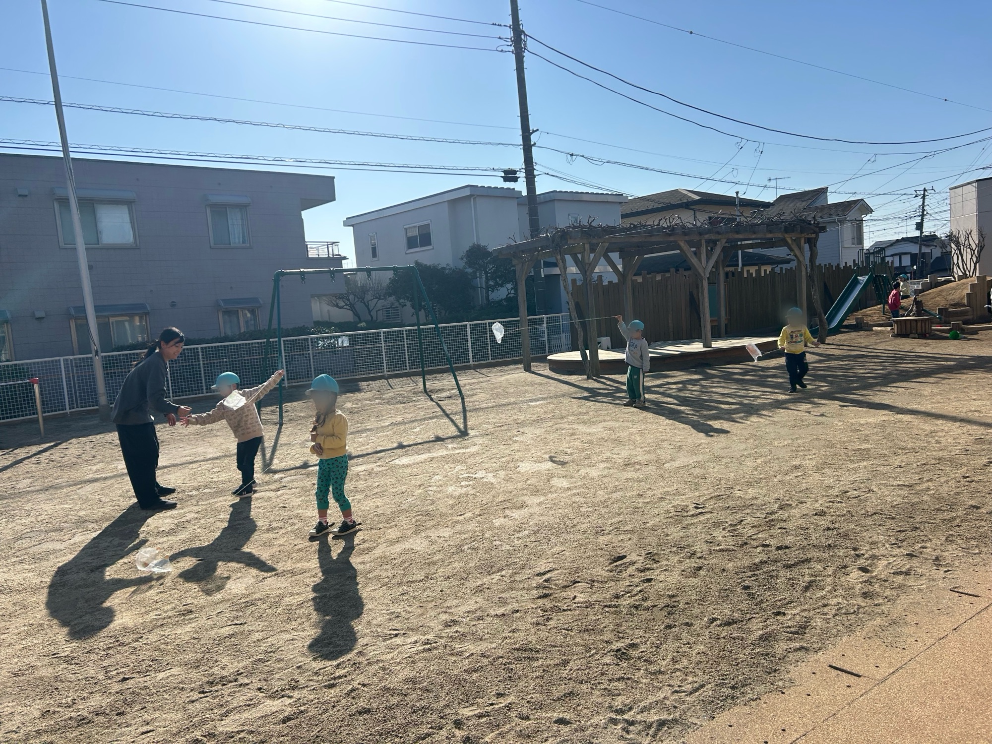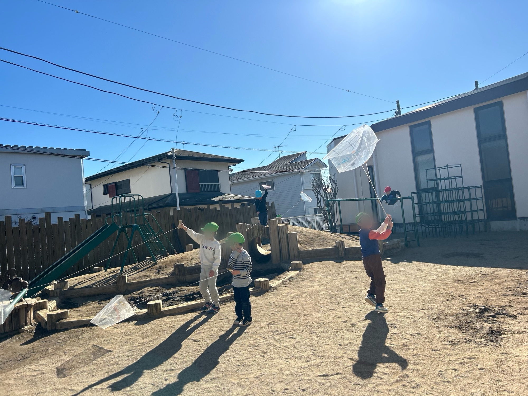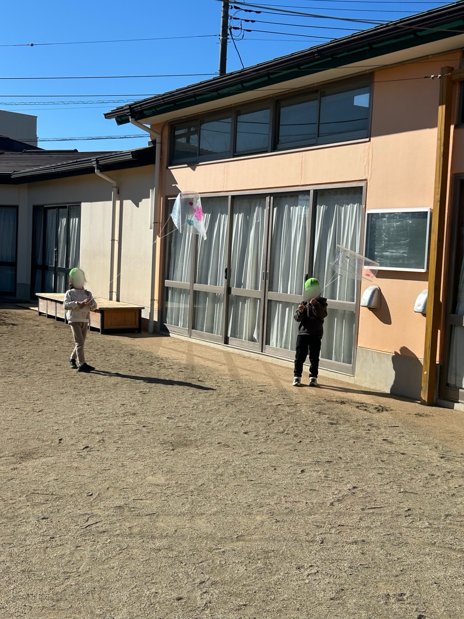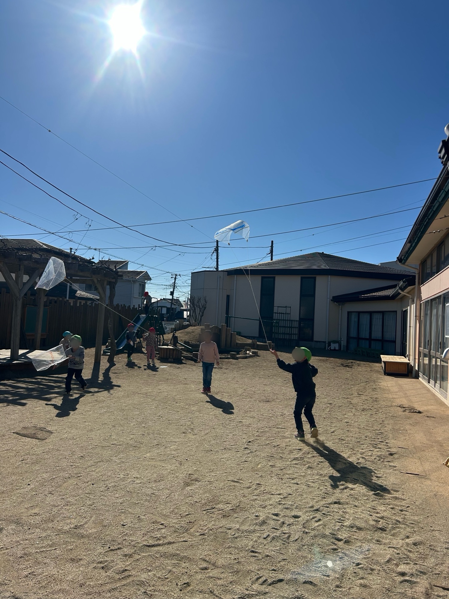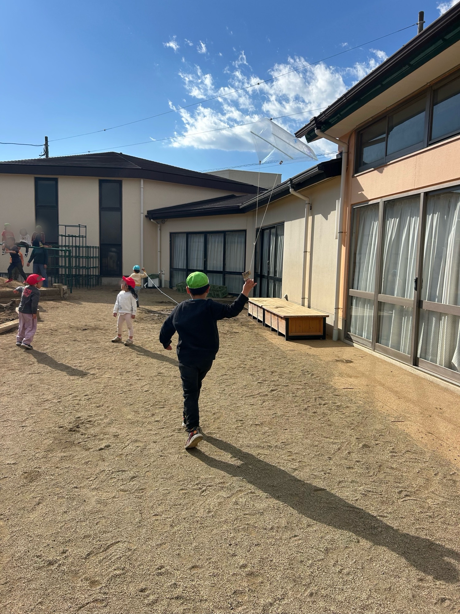良い風が吹いていた日、園庭で凧揚げをしました。風に乗って凧が空へ上がった時の子どもたちの嬉しそうな顔☺元気よく走っていました。