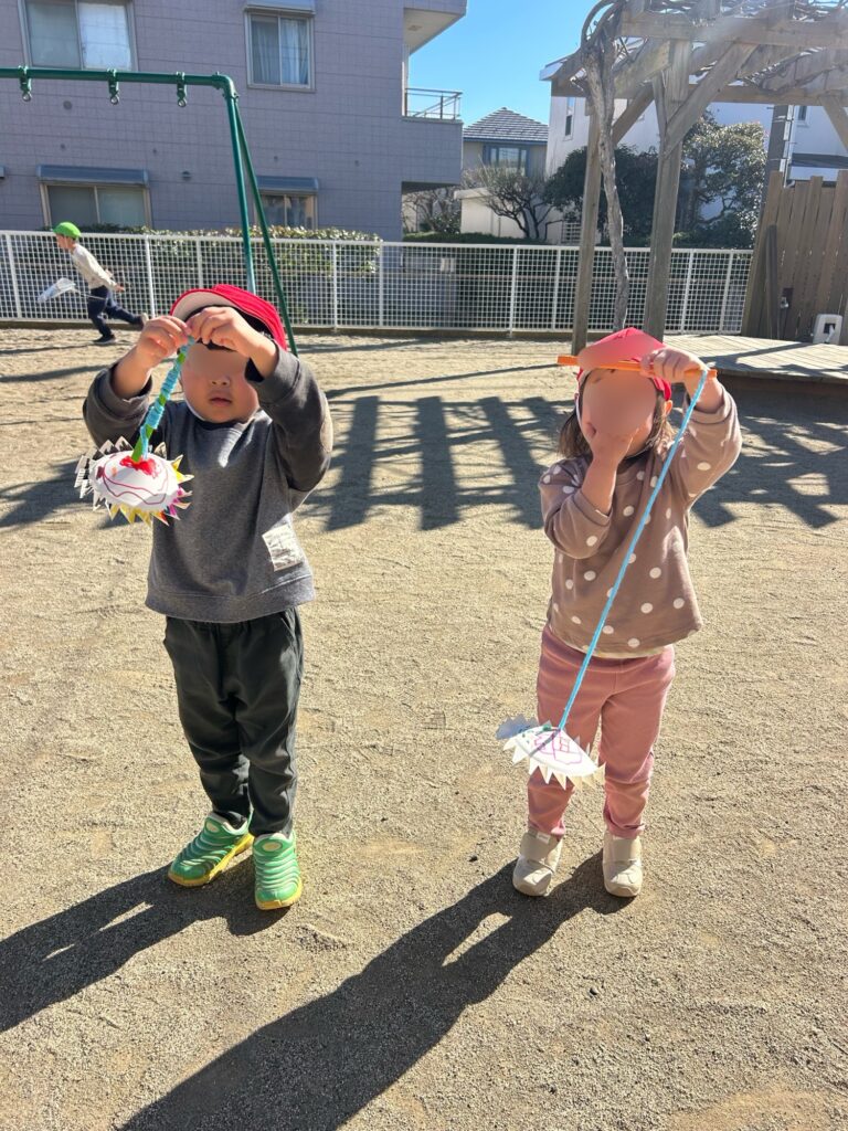マルコ幼稚園では、3学期開始と共に、クラスごとに異なる凧の製作、男の子が大好きなコマ回しの遊びが始まります。