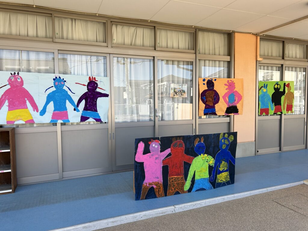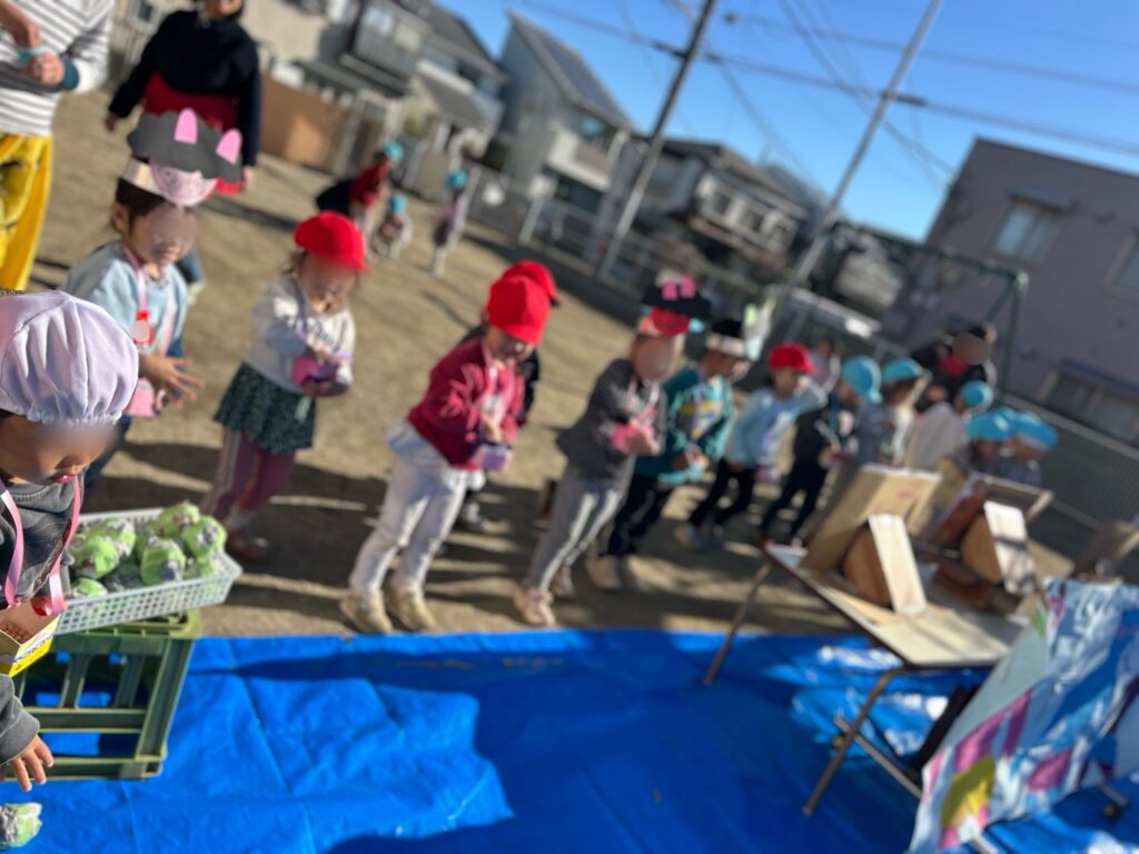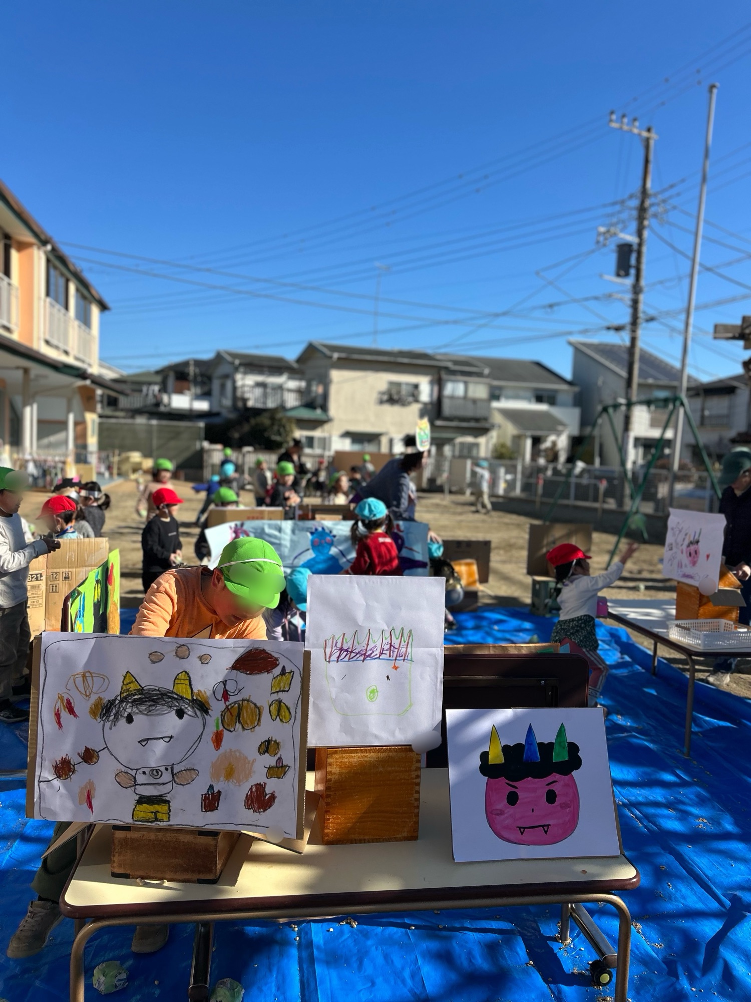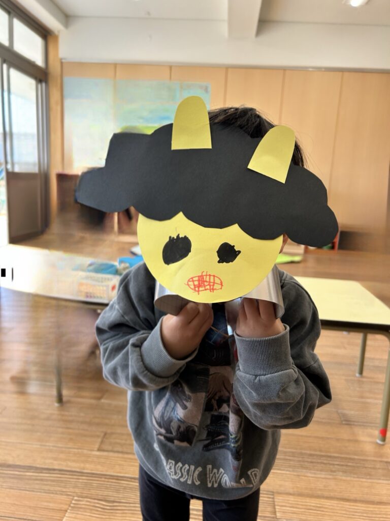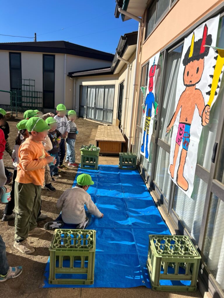 園では、年中クラスが主導となって作った鬼を園庭に設置し、豆まきをしました。