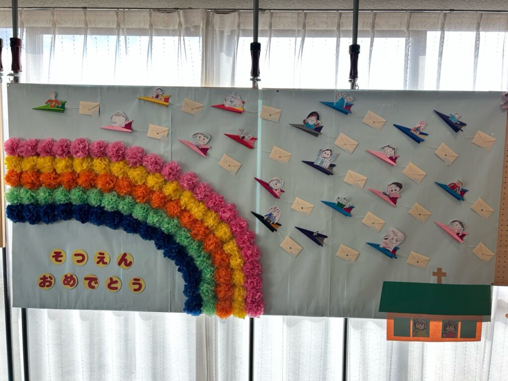3月17日(火)修了礼拝が、翌18日に卒園式が行われました。 1年間、楽しかったこと、頑張ったこと、涙したこと、喧嘩したこと、などたくさんの思い出がありました。園庭を走り、雲梯やジャングルジム等の遊具で遊び、お散歩に行き、工作やブロック遊びをたくさんし、行事でクラスの仲間と力を合わせお友だちとの関係をより深めました。 それら全てが子どもたちにとって良い経験につながりました。大きく成長をした子どもたち。これからも神さまに見守られ、光の子として歩んでいってください。